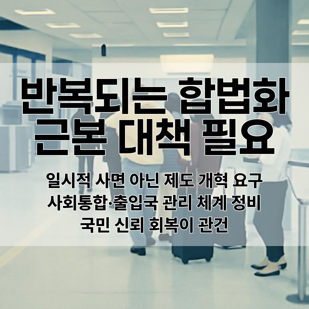 특별합법화가 반복되면서 불법체류에 대한 잘못된 신호를 보낸다는 지적이 제기되고 있으며, 출입국 관리 시스템 개혁, 사각지대 해소, 체계적 사회통합 프로그램 등 근본적 해결책이 필요하다는 요구가 증가하고 있다.