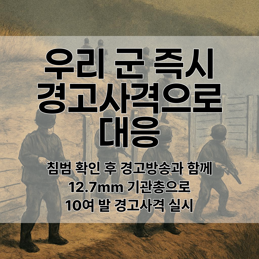 상황이 심각함을 판단하고 12.7mm 대구경 기관총으로 경고사격을 가했어요. 약 10여 발의 경고사격 후 북한군은 곧바로 북상해서 군사적 대치 상황은 일단 해소됐죠.