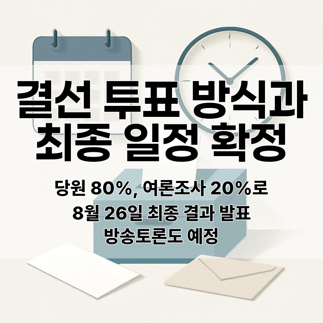 결선 투표는 체계적이고 공정한 방식으로 진행될 예정이에요. 먼저 8월 23일에 방송 토론이 열리고, 24일에는 온라인 투표, 25일에는 ARS 투표가 순차적으로 실시됩니다.