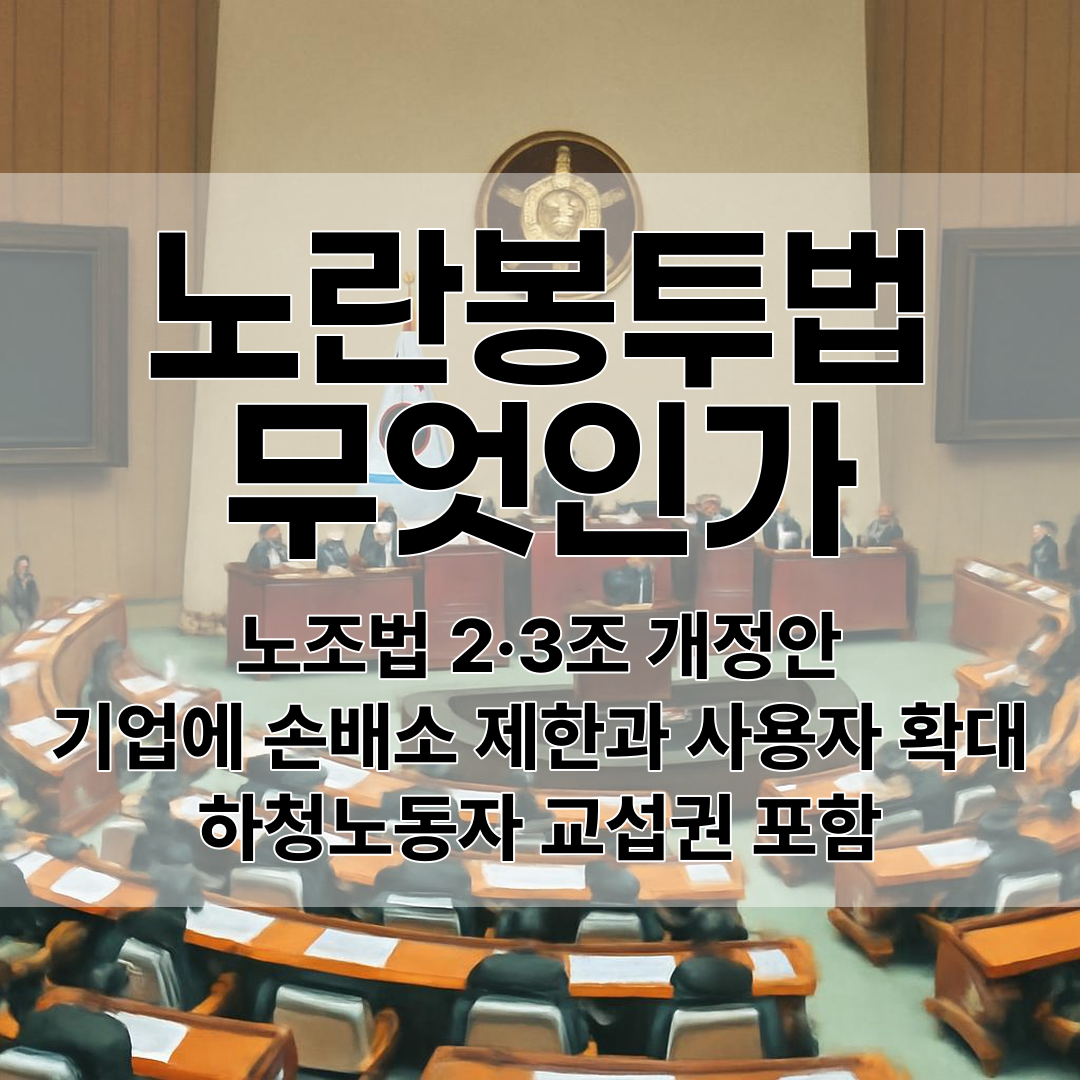 노란봉투법의 정식 명칭은 「노동조합 및 노동관계조정법」 개정안입니다. 이 법안의 핵심은 크게 두 가지로 나뉘어요.